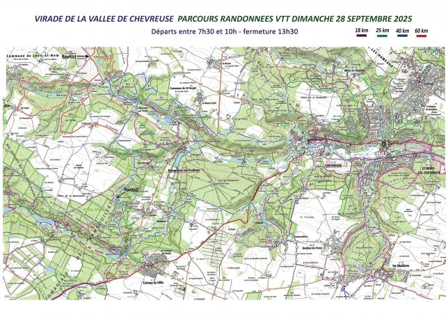 Plusieurs circuits VTT ont été élaborés pour vous afin de vous faire découvrir la région de la vallée de Chevreuse. Ce n’est pas une compétition, les départs sont libres et aucun classement n’est effectué. Les parcours sont en dehors des voies ouvertes à la circulation. Le fléchage est effectué selon les règles de la fédération française de cyclotourisme et de l’ONF. Dés le dimanche matin des équipes de l’organisation sont chargées , avant le passage des randonneurs , de vérifier l’état du fléchage et des systèmes de sécurité mis en place . Le dé fléchage est réalisé le jour de la randonnée pour les circuits courts et une partie des grands circuits . Le tout étant terminé le lundi.